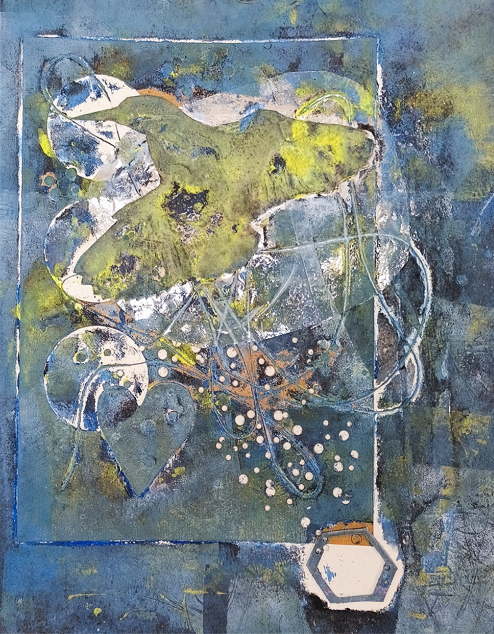 Bei der Collagraphie handelt es sich um eine künstlerische Technik, bei der verschiedene Materialien wie Papiere, Klebebänder, Fäden, strukturierte Materialien, Tetra Pak, Wellpappe, etc. in einer Art Collage (daher kommt der Name) auf eine Trägerplatte aufgeklebt werden.
